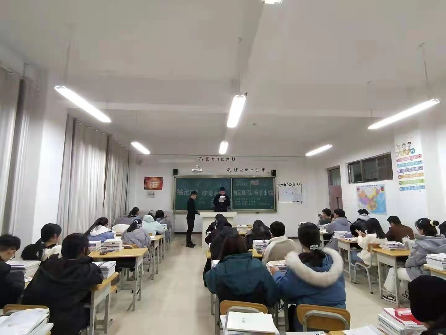 主题班会中,大家面对国旗庄严宣誓:“铭记历史,勿忘国耻;努力学习,求真学问,练真本事,知行合一,报效祖国;为实现中华民族伟大复兴的中国梦而努力奋斗”。诤诤誓言入耳入心,令人鼓舞。在三分钟庄严肃穆沉重的默哀时间后,由辅导员老是带领学生重温了那段屈辱惨烈的岁月,加深了学生对历史的了解,增强了学生民族责任感和自尊自强心。在主题演讲环节,学生准备充分,仪态大方自然,激情饱满的诵读了稿件,气氛肃穆有序,每个同学都发表了自己的感悟和理解。主题班会呼吁青年大学生树立与新时代主题同心同向的理想信念,勇于担当时代赋予的历史责任。
